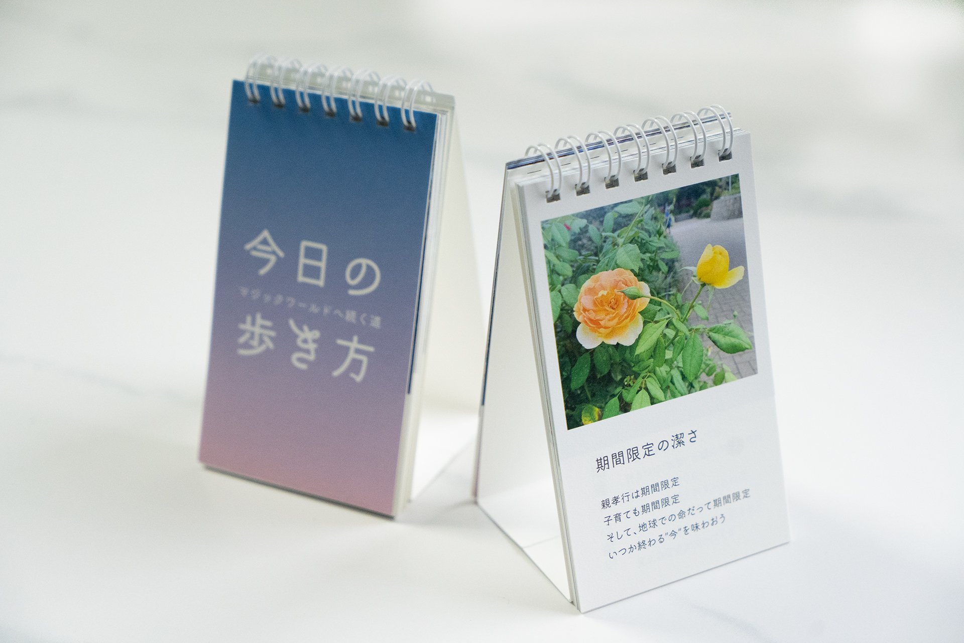 日々どういう思いで暮らしていくと、自分も世界も納得するようなそんな軽やかな生き方ができるかという内容のハガキサイズの日めくりです。